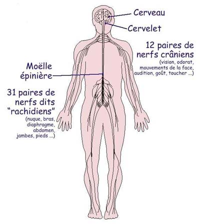 Il s'agit des nerfs dont les ramifications atteignent tous les points du corps et notamment les organes récepteurs, les terminaisons nerveuses et les organes effecteurs tels que les muscles. Les nerfs sont composés de cellules nerveuses, appelés aussi neurones. Ce sont les neurones qui véhiculent les informations nécessaires au système nerveux central pour exercer son contrôle. Ces informations proviennent du milieu extérieur (température, humidité etc...) ou de notre organisme (pression artérielle, pressions partielles de CO2 dans le sang etc!...).