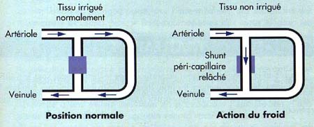 Quand il à froid, l'organisme augmente sa production de chaleur pour maintenir sa chaleur interne. Si cette production ne suffit pas, il va concentrer ses efforts pour maintenir la température centrale du corps et des organes vitaux, au détriment des organes et tissus périphériques: Grâce au système orthosympathique (augmentation du taux d'adrénaline), il va s'opérer une vasoconstriction des vaisseaux périphérique et les sphincters (fibres musculaires) péri capillaires vont ouvrir des shunts artériels. De cette manière l'organisme diminue les pertes calorifiques du sang dans les régions proches de la surface d'échange.